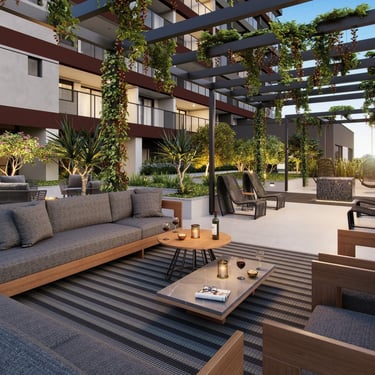 4º andar: Lavanderia, Fitness, Crossfit, Yoga, Coworking, Jardim Descoberto, Pit Fire e Praça da Fonte.